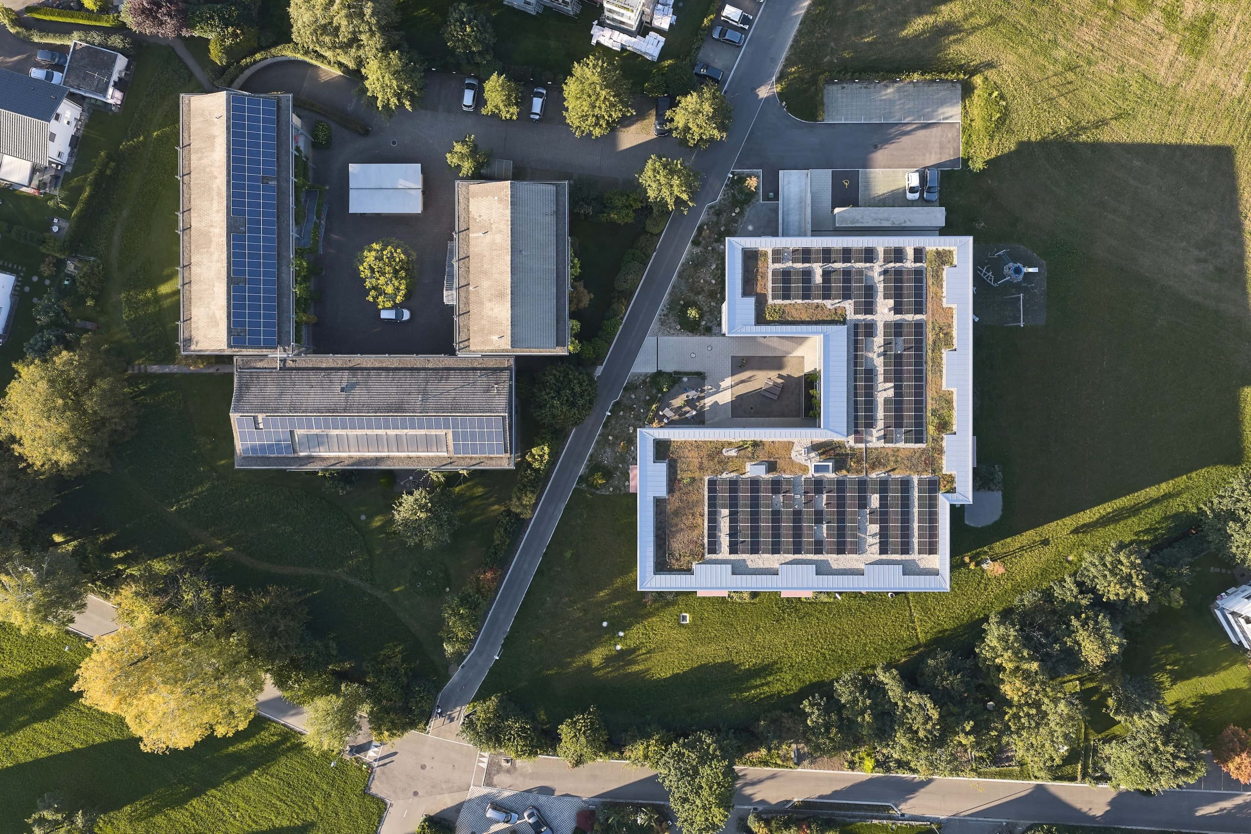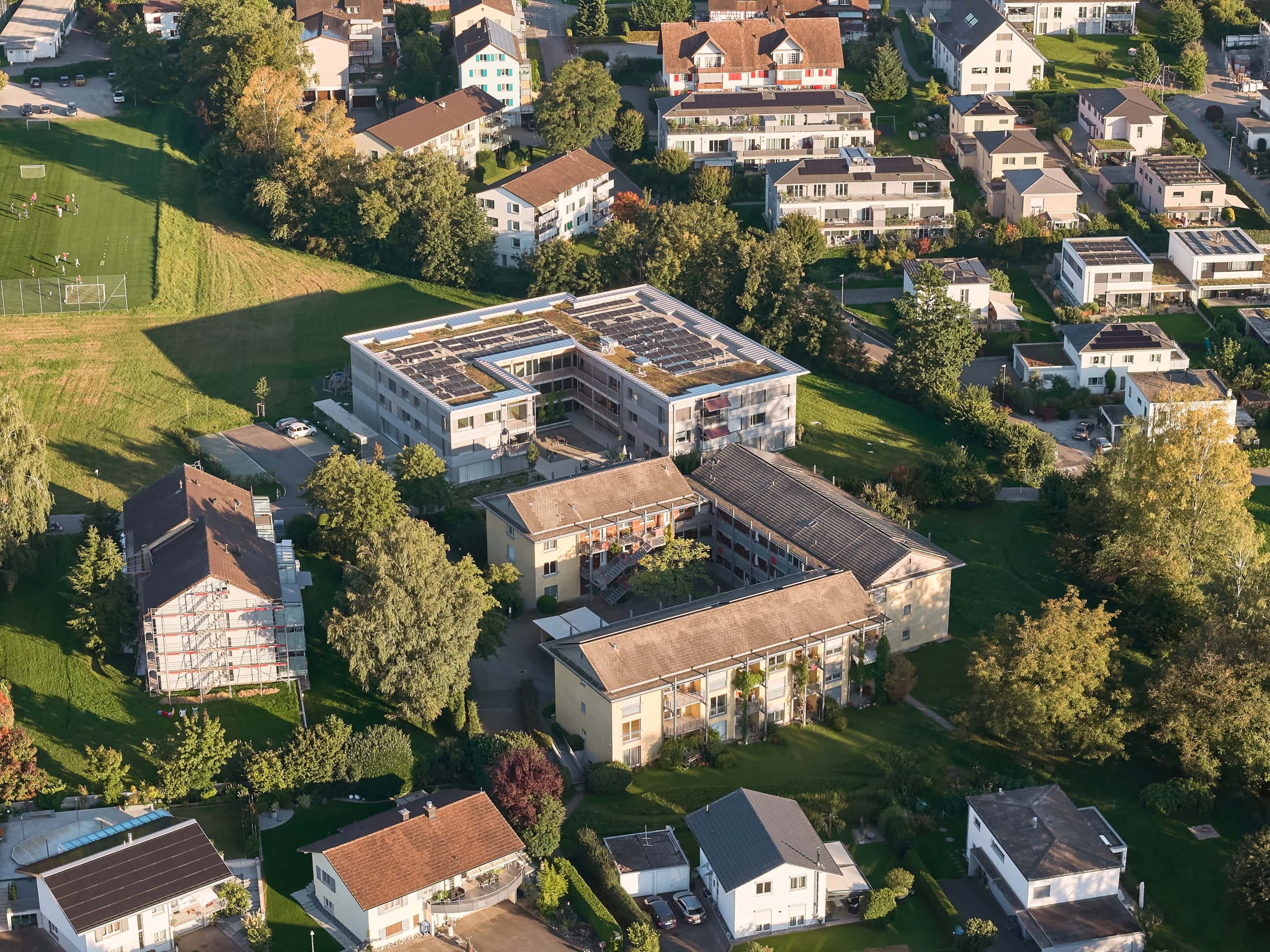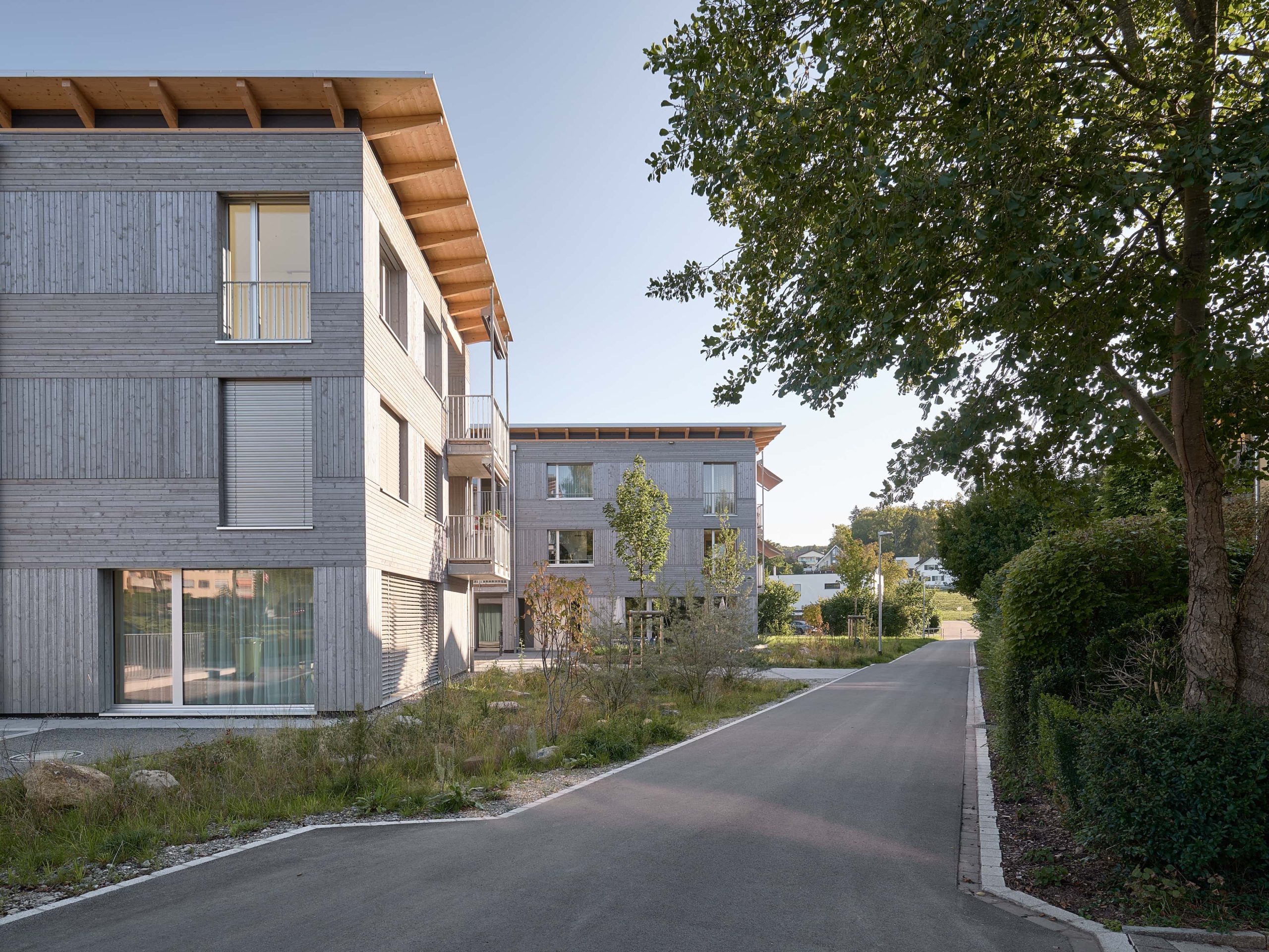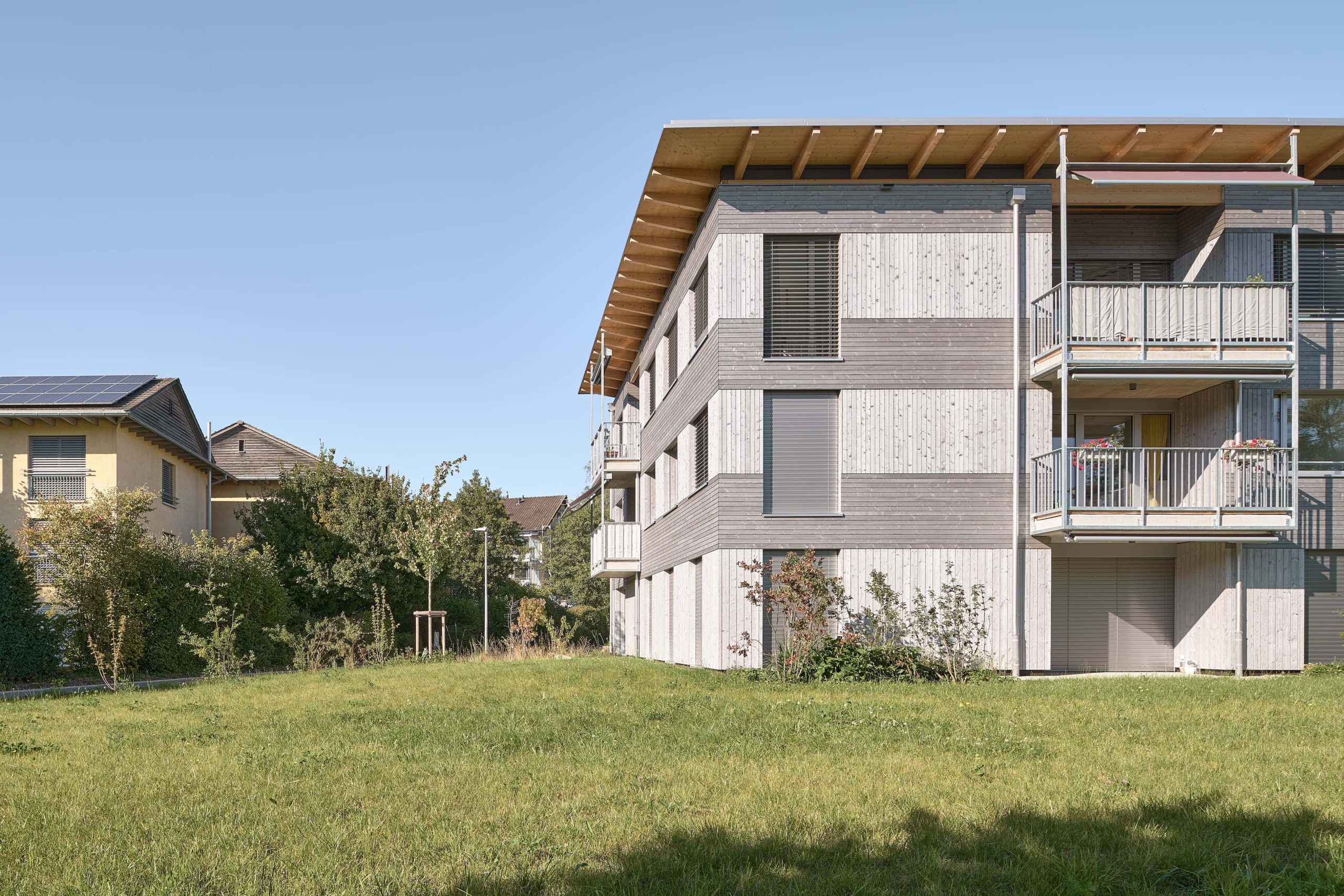 Ein umlaufendes, unterschiedlich tiefes Vordach prägt die äussere Erscheinung. Mit den daran befestigten, aus der Fassade springenden Loggien, verbindet sich dieses zu einer gestalterischen Einheit, welche den Baukörper gliedert und rhythmisiert