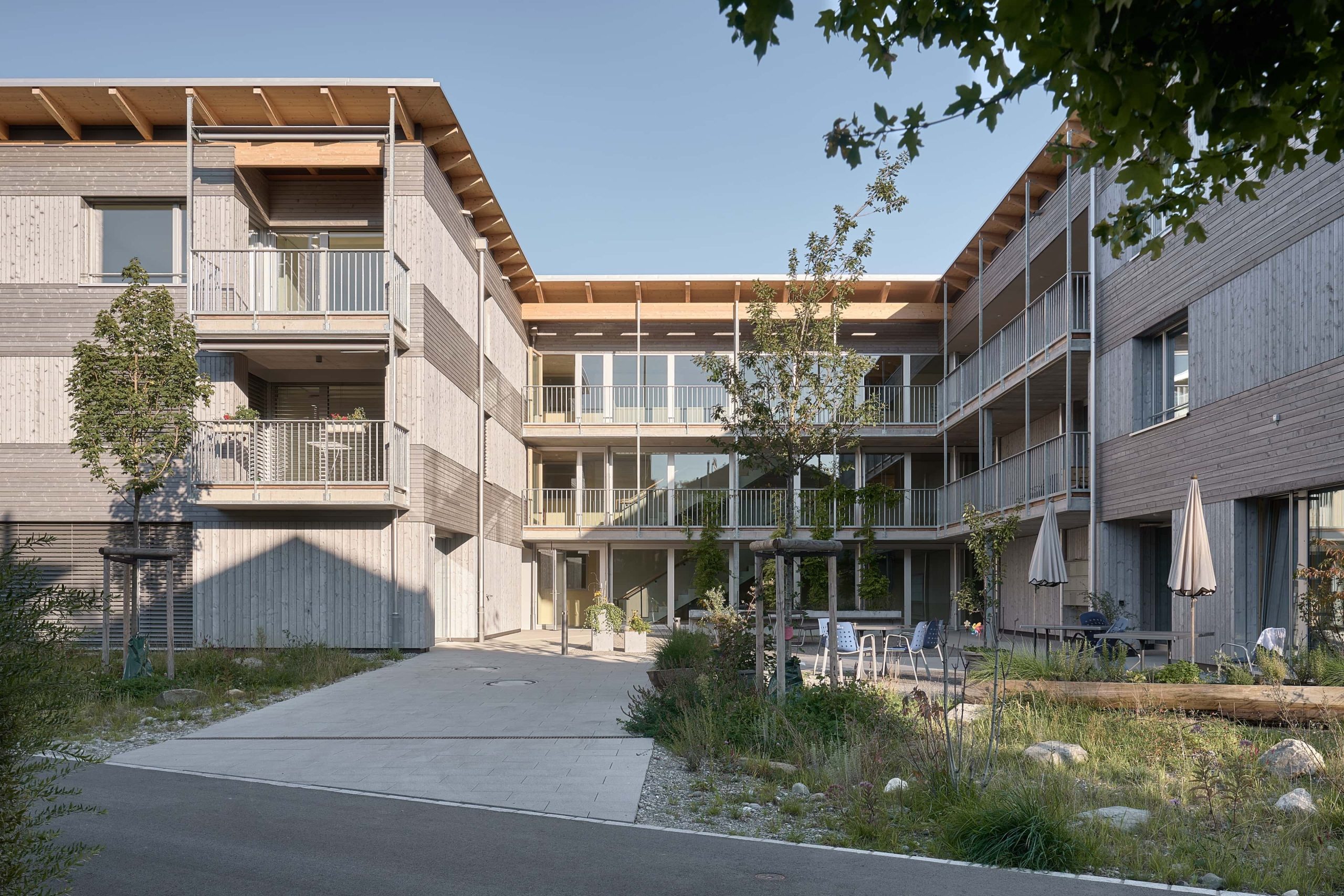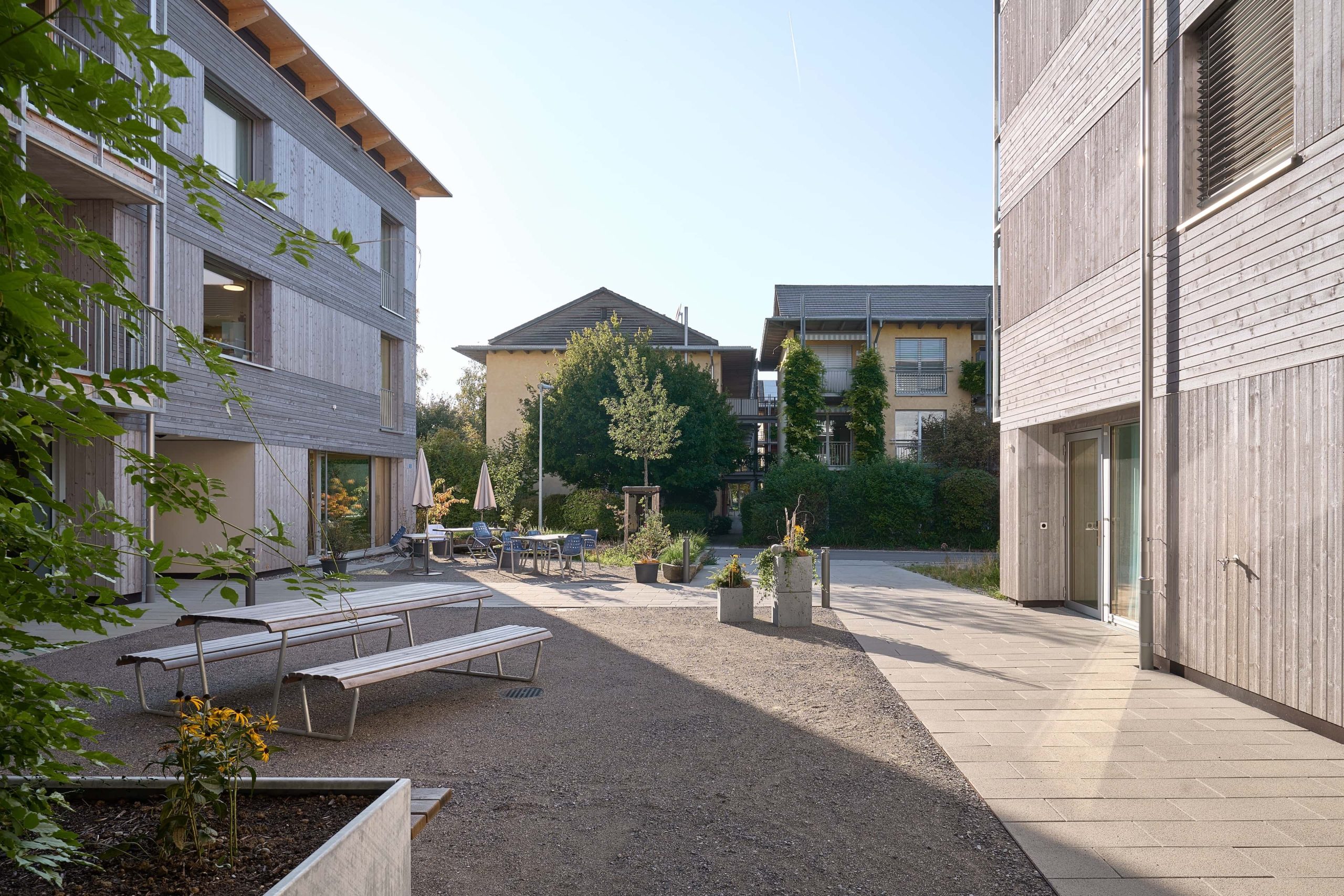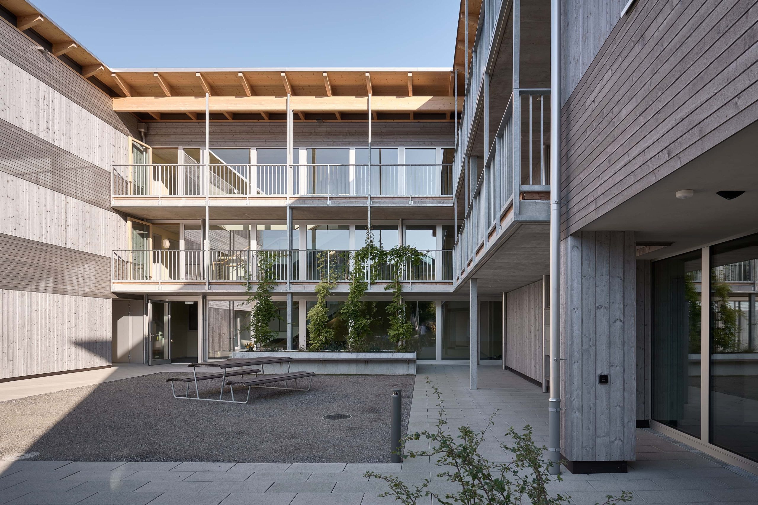 Die Nutzungen mit öffentlichem Charakter (Gemeinschaftsräume, Arztpraxis, Laden, Jugendtreff, etc.) und der Haupteingang sind um den Hof im Erdgeschoss angeordnet. Durch die Ausformulierung der Hoffassade in den Obergeschossen als Lauben, strahlt der Hofraum einen halböffentlichen Charakter aus. Die Laube dient darüber hinaus als Begegnungsort.